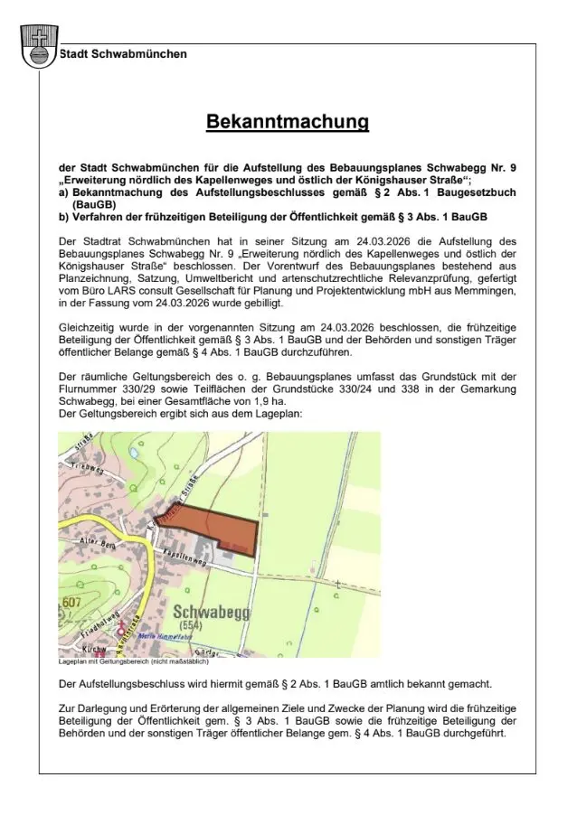 Bekanntmachung der Stadt Schwabmünchen für die Aufstellung des Bebauungsplanes Schwabegg Nr. 9 „Erweiterung nördlich des Kapellenweges und östlich der Königshauser Straße“;