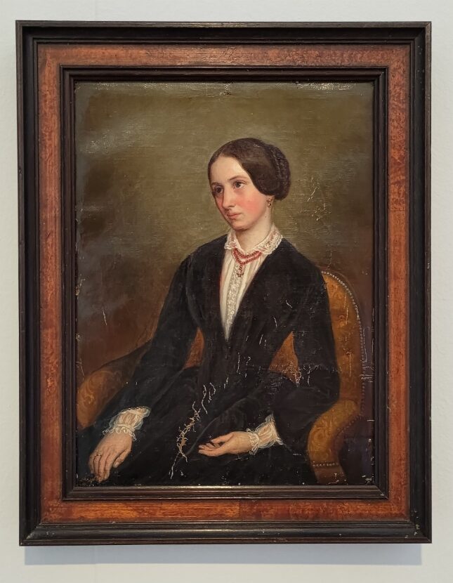 Spätestens ab diesem Punkt waren alle Beteiligten hellauf begeistert und recherchierten weiter: Ja, Mitglieder der Familie Herele hatten Schwabmünchen vor Kriegsende verlassen und sich in Nordschwaben ein neues Heim gesucht. Dort fand 2023 die Wohnungsauflösung statt, aus der die beiden Porträts in das Augsburger Auktionshaus gelangten. Die Porträts waren jedoch auf das Jahr 1851 datiert – viel zu spät also, um Alt-Bürgermeister Franz Borgias Herele und seine Frau darstellen zu können, die beide im Jahr 1848 verstorben waren. Stattdessen passten nur die Lebensdaten von zwei Mitgliedern der Familie Herele zu den Dargestellten: Jene von Julius Herele (1824-1903) und seiner Frau Maria Herele geb. Rauch (1830-1886), die im Jahr 1850 in Untermeitingen geheiratet hatten. Zwei Jahre nach dem Erwerb des Damen-Porträts war es dem Museum also tatsächlich gelungen, das Geheimnis zu lüften: Die „Dame in Schwarz“ ist Maria Herele! Damit hat das Schwabmünchner Museum nun zwei verschwägerte Hereles in seiner Gemäldesammlung. Die Herren Bauer und Grünfelder hatten hingegen endlich die Gewissheit, dass die Gemälde ihrer Vorfahren den Zweiten Weltkrieg überdauert haben.