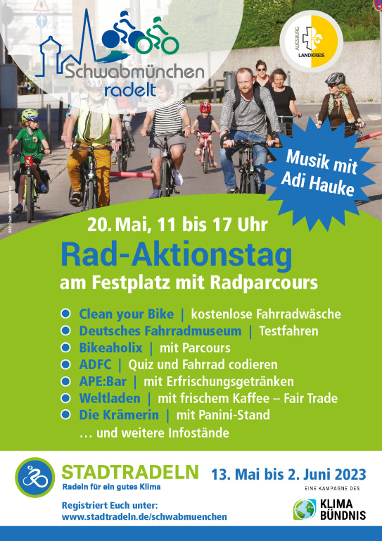 Zu diesem Anlass findet am Samstag, 20. Mai von 11-17 Uhr für alle Radl-Fans ein Rad-Aktionstag auf dem Festplatz Schwabmünchen in Kooperation mit dem Landratsamt statt.