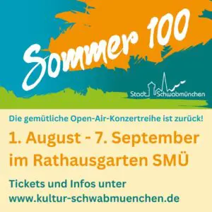 Die gemütliche Open-Air-Konzertreihe Sommer 100 des Kulturbüros der Stadt Schwabmünchen lässt auch in diesem Jahr wieder die Herzen der Musikfans höherschlagen. An insgesamt 14 Konzerttagen bringen regionale und überregionale Musikerinnen und Musiker die unterschiedlichsten Musikgenres auf die Bühne im Rathausgarten und in den Stadtteilen Mittelstetten, Schwabegg und Klimmach. Darunter sind Schwabmünchner Originale, wie Acoustic Revolution, King B., Who of us, die Hautnah Music Band und die Musikgruppen aus Schwabegg, aber auch Gäste aus München oder Wien.