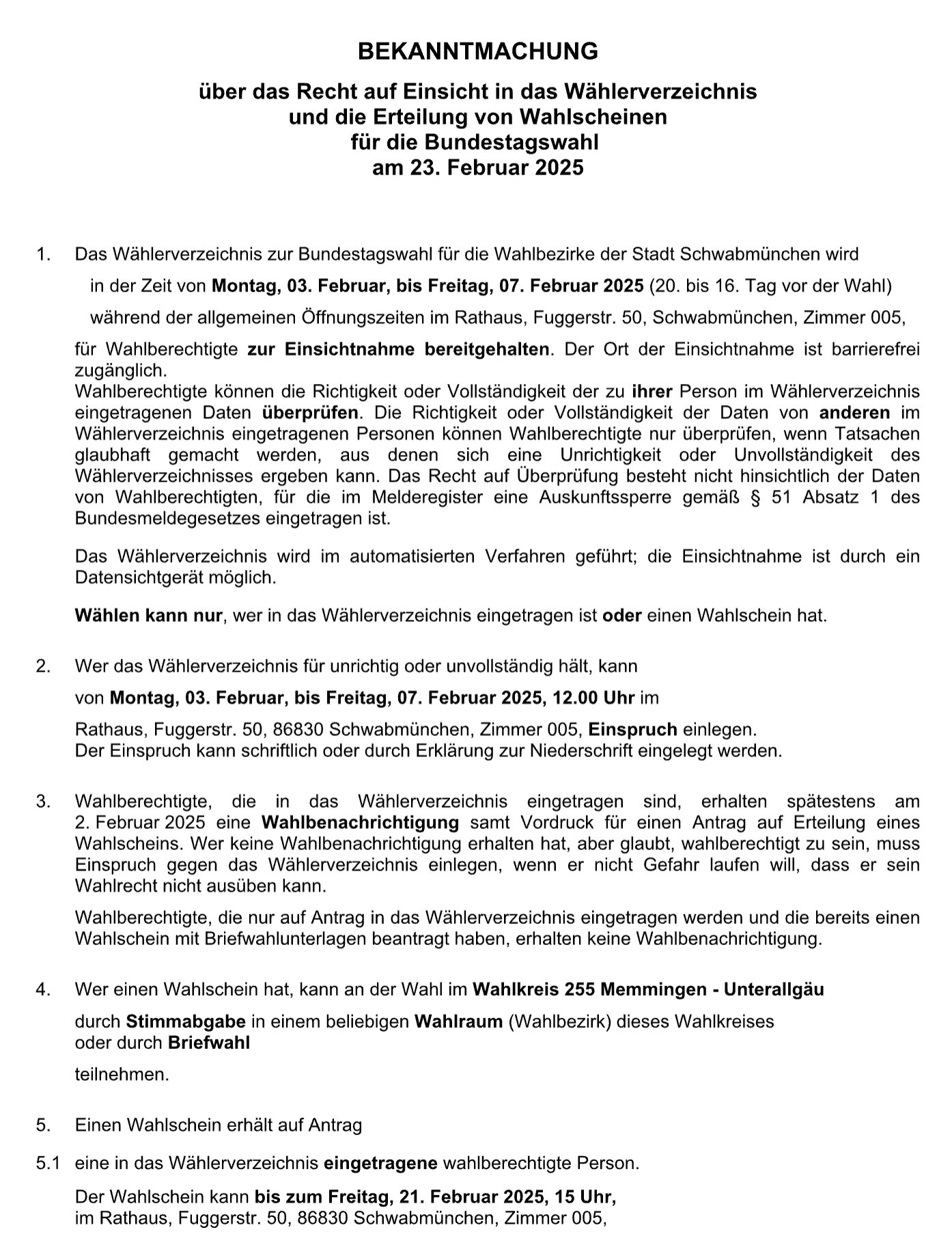 Amtliche Bekanntmachung über die Einsicht in das Wählerverzeichnis vom 23. Januar 2025