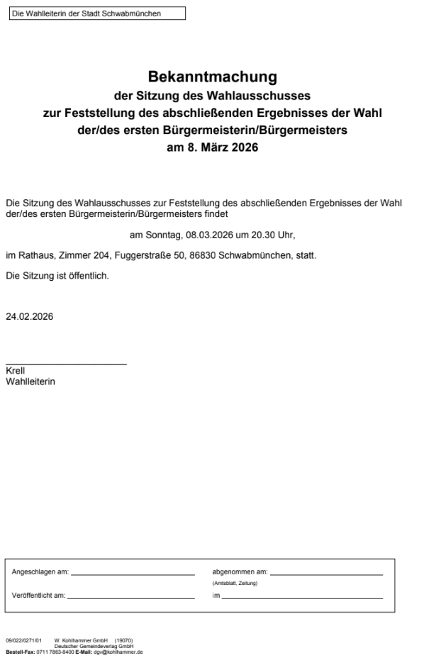 Bekanntmachung Sitzung Wahlausschuss abschließendes Ergebnis Bürgermeisterwahl